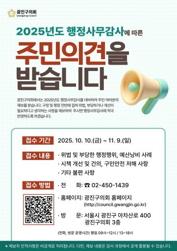 [비건뉴스=최지영 수습기자] 광진구의회가 오는 11월 17일부터 진행되는 ‘2025년도 행정사무감사’를 앞두고 주민 의견을 10월 10일부터 11월 9일까지 총 31일간 접수한다.