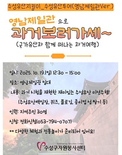 [비건뉴스=최지영 수습기자] 수성구자원봉사센터 소속 수성유산지킴이는 오는 19일 영남제일관 일대에서 지역 주민을 대상으로 한 문화 체험 프로그램 ‘영남제일관으로 과거 보러 가세’를 진행한다.