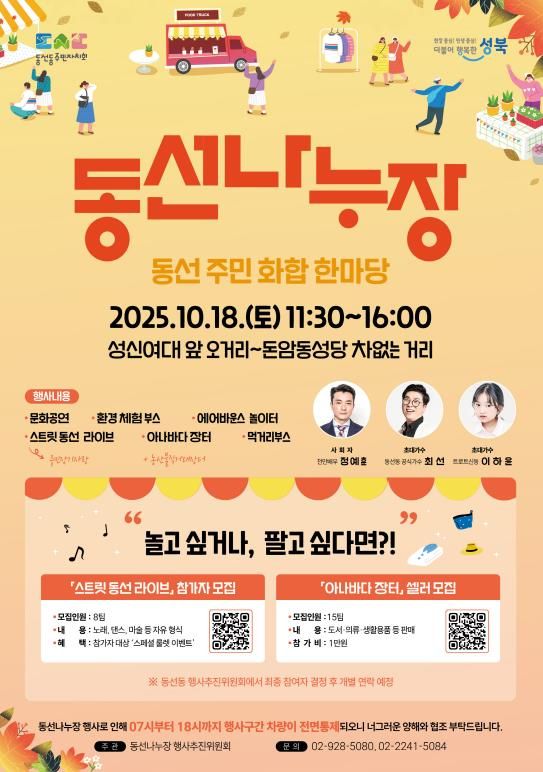 올해 축제는 주민이 직접 주체가 되어 꾸미는 다채로운 프로그램으로 풍성하게 마련됐다. ▲불필요한 물품을 사고팔며 자원의 가치를 되살리는 ‘아나바다 장터’, ▲노래·춤·연주 등 재능을 펼치는 주민 장기자랑 무대 ‘스트릿 동선 라이브’, ▲아이들을 위한 에어바운스 놀이터와 다양한 체험 부스가 대표적이다. 이 밖에도 문화공연, 먹거리 부스, 행운권 추첨 등 즐길 거리와 볼거리가 이어져 남녀노소 모두가 함께 즐길 수 있는 하루가 될 예정이다.