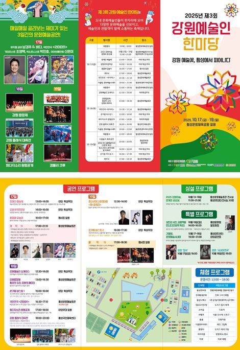 정연길 강원특별자치도 문화체육국장은 “이번 행사는 지역 예술인들이 한자리에 모여 문화예술의 가치를 나누고 도민과 함께 즐기는 교류의 장이 될 것”이라며, “앞으로도 예술인과 도민이 함께 문화를 만들어가는 기회를 지속적으로 확대해 나가겠다”고 밝혔다.