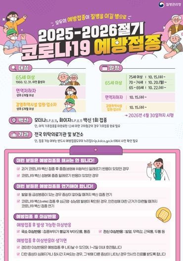 접종은 10월 15일 75세 이상(1950년 이전 출생자)을 시작으로 순차 진행한다. 70~74세(1951~1955년생)는 10월 20일, 65~69세(1956~1960년생)는 10월 22일부터 접종한다. 생후 6개월 이상 면역저하자와 감염취약시설 입원·입소자도 10월 15일부터 접종을 시작한다. 기간은 내년 4월 30일까지다.