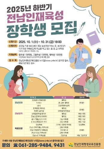 [비건뉴스=최지영 수습기자] 전라남도와 전남인재평생교육진흥원은 실질적인 교육기회 보장과 미래인재로의 성장, 지역 정착을 지원하기 위한 2025년 하반기 전남인재육성 장학생을 오는 31일까지 모집한다.