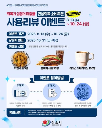 참여 방법은 간단하다. 정읍시민이라면 누구나 소비쿠폰 사용 매장에서 결제 후 인증샷을 찍고, 개인 SNS(블로그·인스타그램·페이스북·카카오스토리·카카오톡 채널 등)에 ‘#정읍소비쿠폰’ 해시태그와 함께 사용 후기를 올리면 된다. 이후 네이버폼에 게시물 링크와 정보를 입력하면 응모가 완료된다.
