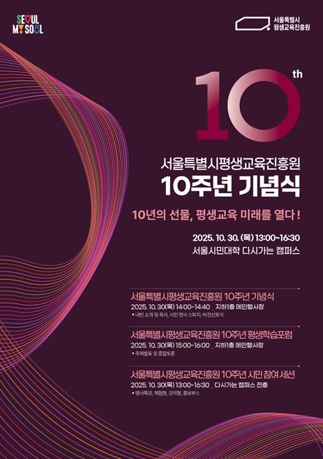 [비건뉴스=최지영 수습기자] 서울시평생교육진흥원이 설립 10주년을 맞아 오는 10월 30일 서울시민대학 다시가는 캠퍼스에서 '서울시평생교육진흥원 10주년 기념식'을 개최한다. 이번 행사는 지난 10년의 성과를 되짚고 미래 비전을 제시하는 자리를 넘어, 시민이 직접 참여하고 즐기는 다채로운 축제의 장으로 마련된다.