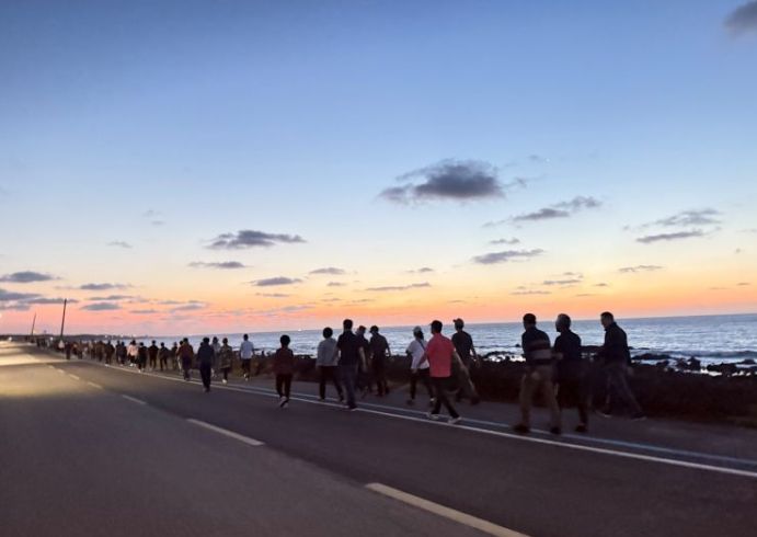 [비건뉴스=최지영 수습기자] 서귀포시는 일상생활 속 1일 7천 보 걷기 활성화를 위하여 11일 새벽 5시 신산리 마을주민들과 함께하는 '힐링 UP! 혼디모영 걸을락(樂)' 신산마을걷기를 운영했다.
