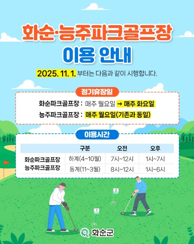 화순군은 화순파크골프장과 능주파크골프장이 매주 월요일 동시에 휴장하던 방식을 변경한다. 화순파크골프장은 매주 화요일에 휴장하고, 능주파크골프장은 기존대로 매주 월요일 휴장한다.