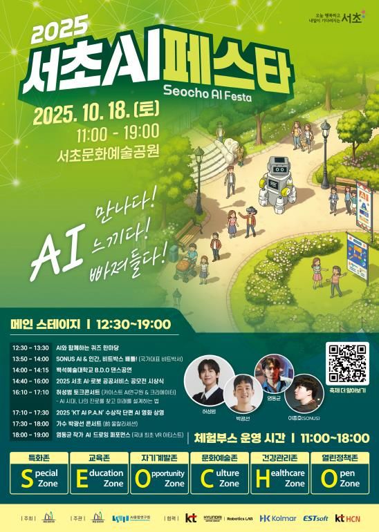 [비건뉴스=최지영 수습기자] 서울 서초구는 ‘양재 AI 특구’ 지정 1주년을 기념해 오는 18일 서초문화예술공원에서 누구나 인공지능(AI)을 만나고, 느끼고, 빠져들 수 있는 ‘2025 서초 AI 페스타’를 개최한다고 밝혔다.
