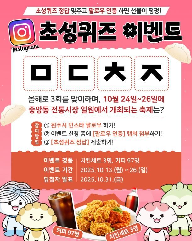 추첨을 통해 총 100명에게 치킨세트(3명)와 커피(97명) 쿠폰이 지급된다. 이벤트 당첨자는 10월 31일 발표되며, 경품은 11월 4일 발송될 예정이다. 자세한 내용은 원주시 공식 SNS(인스타그램, 페이스북, 블로그), 홈페이지, 전광판 등에서 확인할 수 있다.