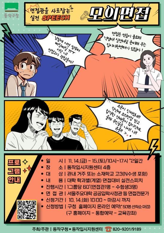 모의 면접은 내달 14~15일 이틀간, 오전 10시부터 오후 5시까지 동작입시지원센터에서 운영된다.