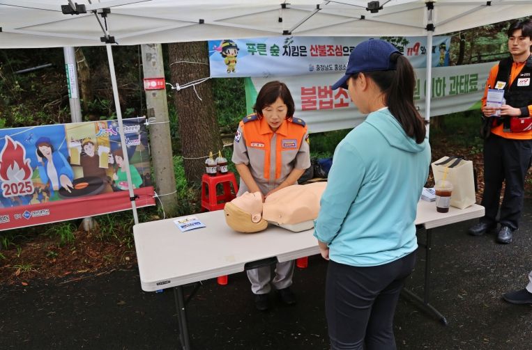이번 행사는 가을철 등산객 증가에 따라 산악사고 및 응급상황 발생 시 신속하고 정확한 신고와 초기 응급처치의 중요성을 알리기 위해 마련됐다. 홍성소방서 구조구급팀은 현장을 찾은 등산객에게 119 신고 시 위치정보 전달 방법, 상황별 신고 요령 등을 안내하고, 심폐소생술(CPR)과 자동심장충격기(AED) 사용법을 직접 체험할 수 있는 실습 부스를 운영했다.
