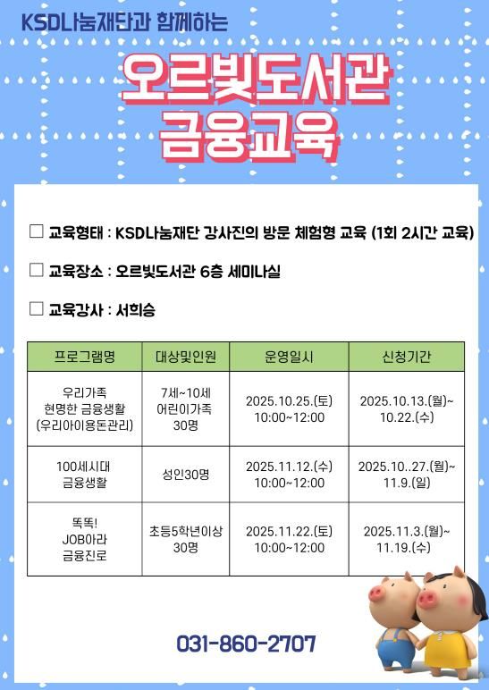 10월 25일에는 7세부터 10세까지 어린이 가족을 위한 ‘우리 가족 현명한 금융생활’, 11월 12일에는 성인을 대상으로 한 ‘100세 시대 금융생활’, 11월 22일에는 초등학교 5학년 이상 청소년을 위한 ‘똑똑! JOB아라 금융진로’ 교육이 진행될 예정이다.