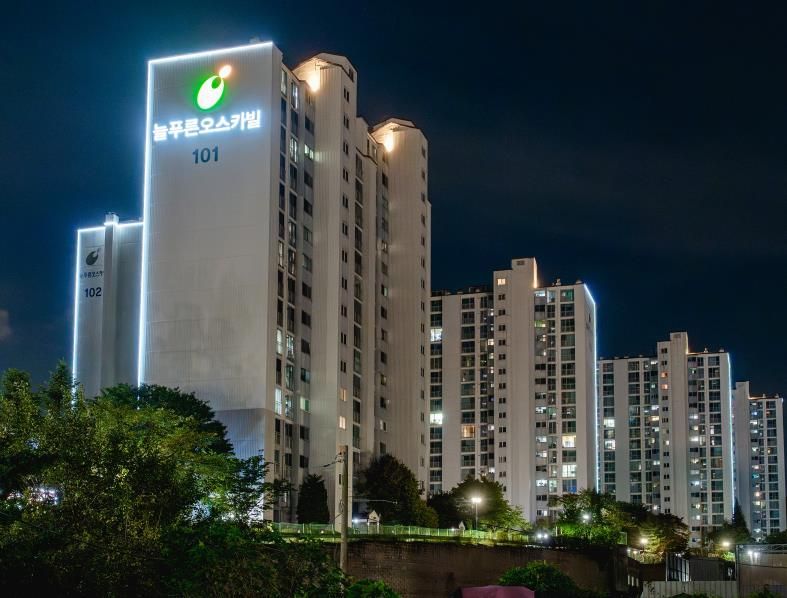 [비건뉴스=최지영 수습기자] 오산시 관내 아파트(공동주택) 단지들이 오색찬란한 빛으로 물들고 있다.