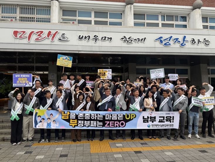 이날 행사는 ‘남을 존중하는 마음은 UP, 부정부패는 ZERO, 남부교육!’이라는 슬로건 아래 진행됐으며, 직원들은 ▲먼저 웃으며 인사하기, ▲서로 존중하는 말 사용하기, ▲대화로 소통하기, ▲배려의 말 건네기 등 상호 존중 문화 조성을 위한 실천과제를 구호로 외치며 적극 참여했다.