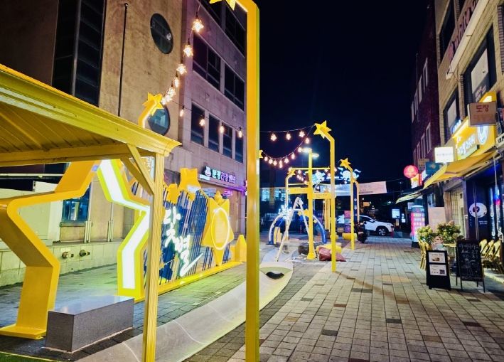 [비건뉴스=최지영 수습기자] 문경시는 점촌원도심상권 130m 구간에 노란색 간판과 어닝을 새로 달고, 상징 조형물 13점, 조형벤치 20개를 설치했으며, 은하수 조명 18m와 360여 개의 파티등으로 ‘닻별 테마길’을 화려하게 완공했다.