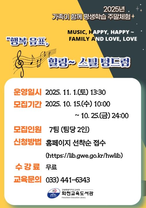[비건뉴스=최지영 수습기자] 강원도교육청 화천교육도서관은 군민을 대상으로 2025년 11월 평생학습 주말체험 ‘늦가을, 가족 음악 특강: 행복 음표, 힐링 스틸 텅드럼’을 운영한다.