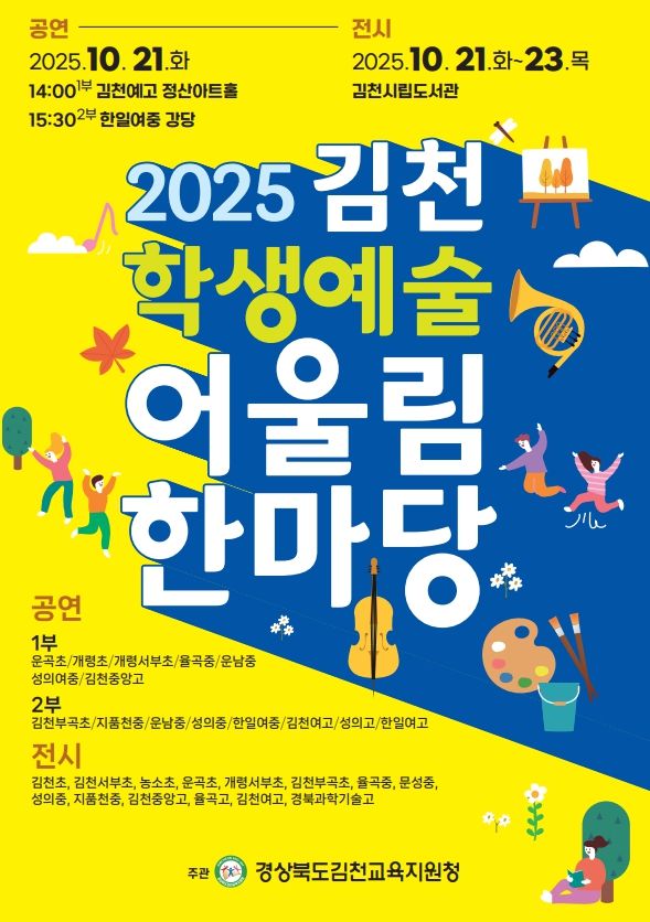 [비건뉴스=최지영 수습기자] 경상북도김천교육지원청은 오는 10월 21일 김천예술고등학교와 한일여자중학교에서 공연 행사를 열고, 김천시립도서관에서 전시 행사(21일-23일)를 통해 ‘2025 김천학생예술어울림한마당’을 개최한다.