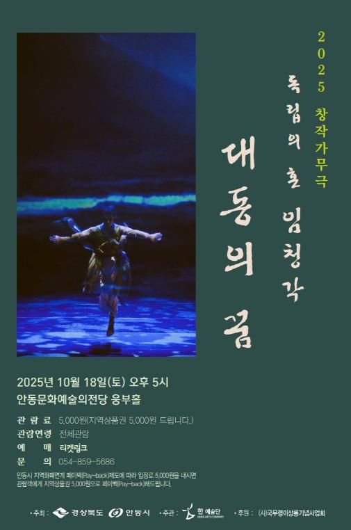[비건뉴스=최지영 수습기자] 한예술단이 주최․주관하는 '2025 창작가무극 독립의 혼 임청각 ‘대동의 꿈’' 공연이 10월 18일 오후 5시, 안동문화예술의전당 웅부홀에서 개최된다.