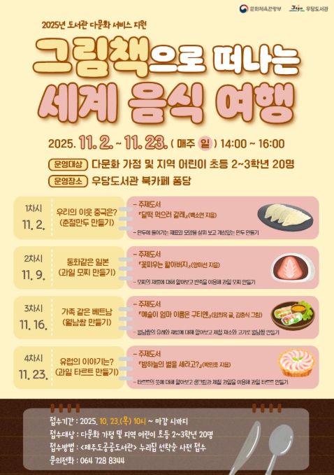 [비건뉴스=최지영 수습기자] 제주시 우당도서관은 2025년 도서관 다문화 서비스 지원 사업인 ‘그림책으로 떠나는 세계 음식 여행’ 프로그램 참여자를 10월 23일부터 선착순 모집한다.
