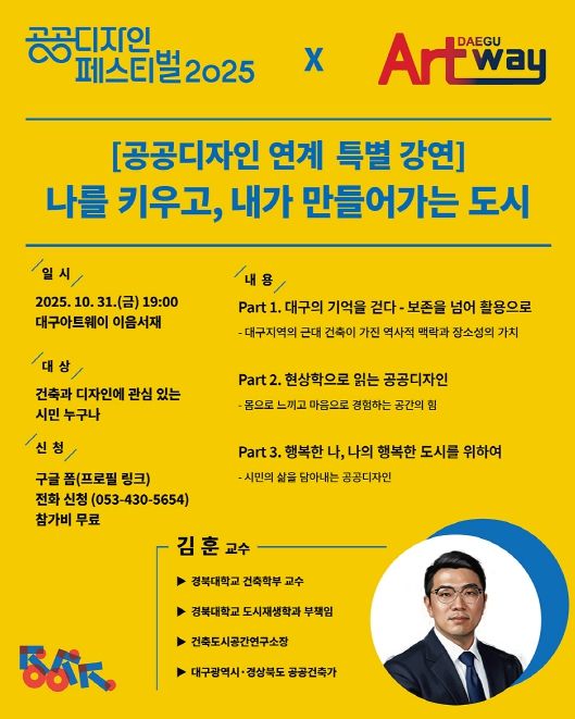31일 저녁 7시에는 대구광역시·경상북도 공공건축가이자 건축도시공간연구소 소장인 김훈 교수(경북대학교 건축학부)의 공공디자인 강연이 진행된다.