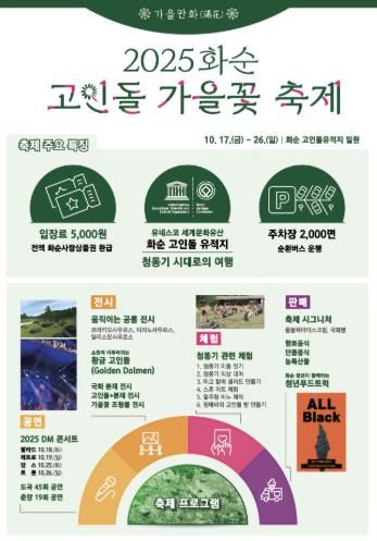 [비건뉴스=최지영 수습기자] 화순군은 10월 17일부터 10월 26일까지 10일간 개최되는 ‘2025 화순 고인돌 가을꽃 축제’에서 통합문화이용권(문화누리카드)으로 결제가 가능한 임시 가맹점 46개소를 운영한다고 밝혔다.