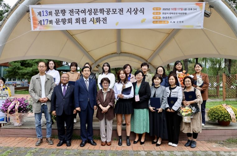 [비건뉴스=최지영 수습기자] 충주 문향회(회장 안애정)에서 주최하는 ‘제13회 문향전국여성문학공모전 시상식과 제17회 문향회 시화전 개막식’이 17일 호암지 생태공원 야외무대에서 열렸다.