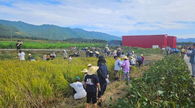 벼 수확 체험은 지난 5월 광의초 학생들이 직접 모내기를 했었던 농지에서 진행됐고, 재학중인 지역학생 13명, 농산유학생 22명 및 학부모 등 60여명이 참여했다.