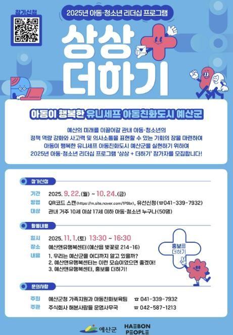 [비건뉴스=최지영 수습기자] 예산군은 아동·청소년이 주체가 돼 아동친화도시 조성에 참여하는 ‘상상+더하기 아동·청소년 리더십 프로그램’의 참가자 모집기간을 기존 10월 17일에서 24일까지로 연장했다고 밝혔다.