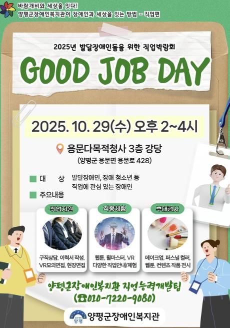 [비건뉴스=최지영 수습기자] 대한불교조계종사회복지재단이 운영하는 양평군장애인복지관은 오는 29일 오후 2시부터 4시까지 용문다목적청사 3층 강당에서 발달장애인의 직업 탐색 기회를 지원하기 위한 직업박람회 ‘GOOD JOB DAY’를 개최한다.