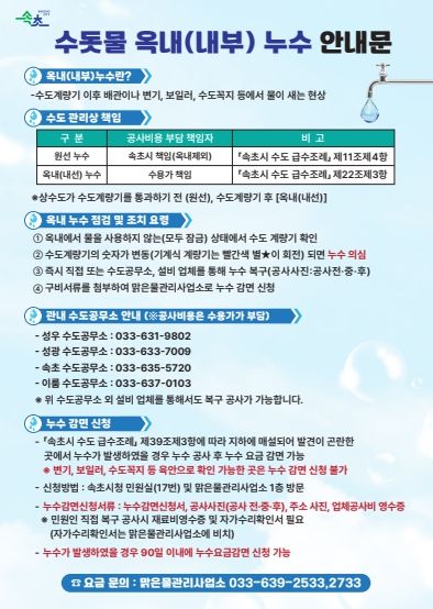 [비건뉴스=최지영 수습기자] 속초시가 ‘수돗물 누수 안내문’을 제작·배포하며 생활 속 물 절약 실천 확산에 나섰다.