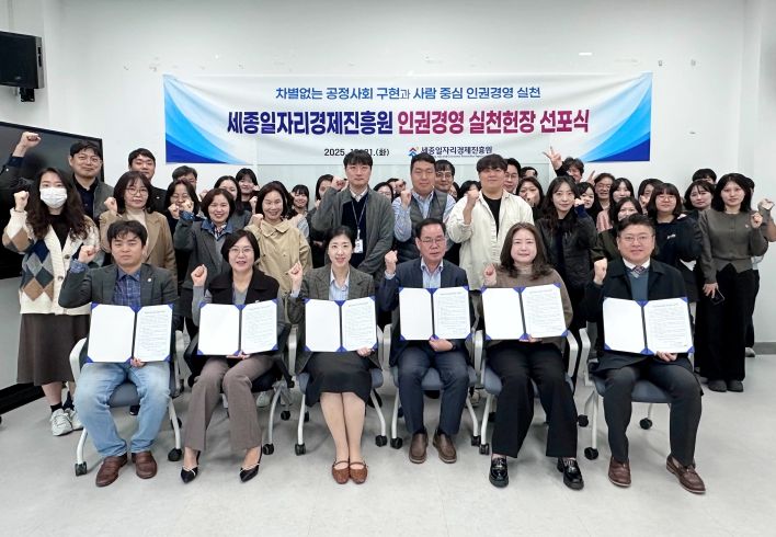 [비건뉴스=최지영 수습기자] 세종일자리경제진흥원(원장 이홍준)은 21일 본원 2층 교육실에서 ‘인권경영 실천헌장 선포식’을 열고 모든 임직원이 인권을 경영의 핵심 가치로 삼아 실천해 나갈 것을 다짐했다.