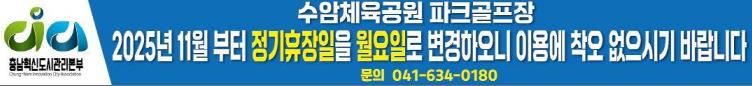 [비건뉴스=최지영 수습기자] 지방자치단체조합 충남혁신도시관리본부는 충남 예산군 삽교읍 목리에 조성된 수암공원 파크골프장의 정기 휴장일을 2025년 11월 부터 수요일에서 월요일로 변경하여 운영한다고 밝혔다.