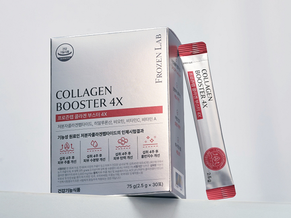프로즌랩에 따르면 ‘콜라겐 부스터 4X’는 피부 진피층의 콜라겐 생성을 촉진해 4주 만에 주름 개선 600% 상승 효과를 보인 인체적용시험 결과를 얻은 신제품이다. 저분자콜라겐펩타이드, 히알루론산, 비타민A, 비오틴, 비타민C 등 5중 성분을 최적의 비율로 배합했다.