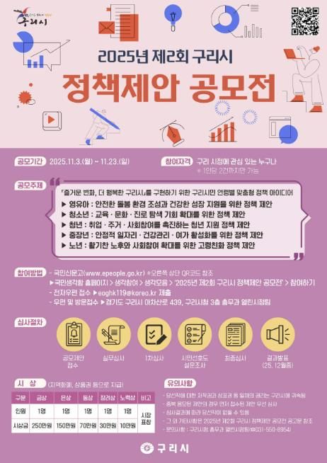 [비건뉴스=최지영 수습기자] 구리시는 오는 11월 3일부터 11월 23일까지'2025년 제2회 구리시 정책 제안 공모전'을 개최한다고 밝혔다. 이번 공모전의 주제는 ‘구리 시민(영유아·청소년·청년·중장년·노년) 나이별 맞춤형 정책 아이디어’다.