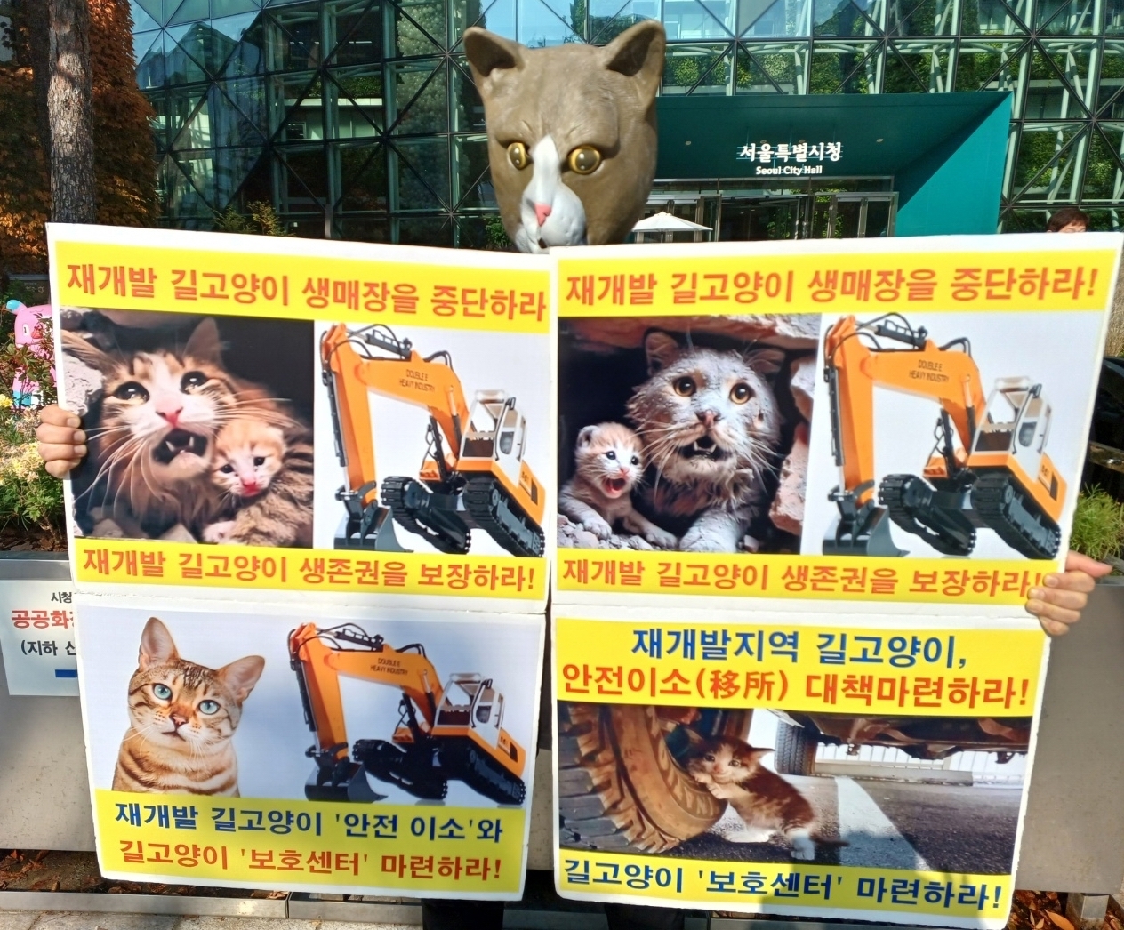 [비건뉴스=최유리 기자] 4일 오후 서울시청 정문 앞에서 한국동물보호연합, 동물의목소리, 동물에게자비를, 동물을위한전진, 카톡동물활동가 등 5개 동물보호단체가 재개발 지역에서 반복되는 길고양이 피해를 막기 위한 기자회견을 열었다. 참가자들은 “재개발 길고양이 생매장을 중단하라”, “우리도 살고 싶다”는 피켓을 들고 생존권 보장과 안전이소 대책 마련을 촉구했다.