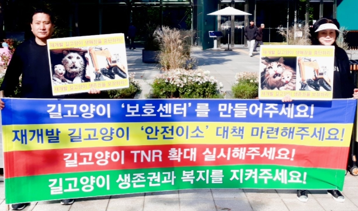 [비건뉴스=최유리 기자] 4일 오후 서울시청 정문 앞에서 한국동물보호연합, 동물의목소리, 동물에게자비를, 동물을위한전진, 카톡동물활동가 등 5개 동물보호단체가 재개발 지역에서 반복되는 길고양이 피해를 막기 위한 기자회견을 열었다. 참가자들은 “재개발 길고양이 생매장을 중단하라”, “우리도 살고 싶다”는 피켓을 들고 생존권 보장과 안전이소 대책 마련을 촉구했다.