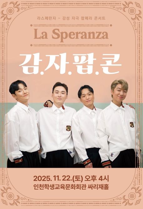 [비건뉴스=최지영 수습기자] 인천광역시교육청학생교육문화회관은 11월 22일 오후 4시, 대공연장 싸리재홀에서 대한민국 최초의 팝페라팀 라스페란자의 공연 ‘라스페란자 감자팝콘’을 개최한다.