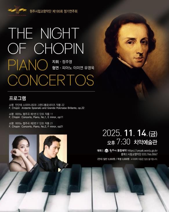 [비건뉴스=최지영 수습기자] 원주시립교향악단은 오는 14일 오후 7시 30분, 치악예술관에서 제195회 정기연주회 ‘The Night of CHOPIN’을 개최한다.