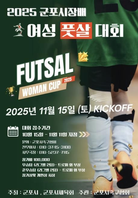 [비건뉴스=최지영 수습기자] 군포시는 여성 생활체육 참여 확대와 건전한 스포츠 문화 확산을 위해 ‘2025 군포시장배 여성 풋살대회’를 오는 11월 15일(토) 군포시 국민체육센터 축구장에서 개최한다.