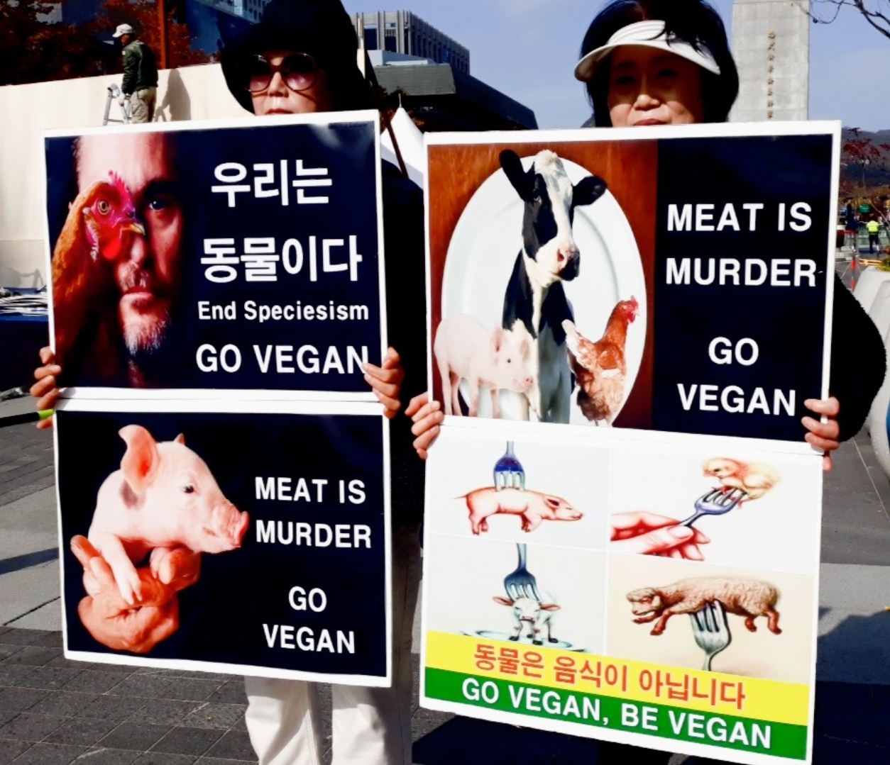 참가자들은 ‘동물억압 중단하라’, ‘Meat is Murder’, ‘Go Vegan!’ 등의 구호를 외치며 피켓과 퍼포먼스로 동물 학대와 착취의 중단, 비건 채식 실천을 촉구했다.