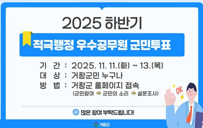 [비건뉴스=최지영 수습기자] 거창군은 오는 11일부터 13일까지 ‘2025년 하반기 적극행정 우수공무원 및 우수사례’를 선정하기 위한 군민 온라인 투표를 실시한다.