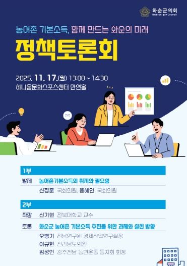 [비건뉴스=최지영 수습기자] 화순군의회는 오는 11월 17일 오후 1시, 하니움문화스포츠센터 만연홀에서 ‘농어촌 기본소득, 함께 만드는 화순의 미래’를 주제로 농어촌 기본소득 정책토론회를 개최한다.