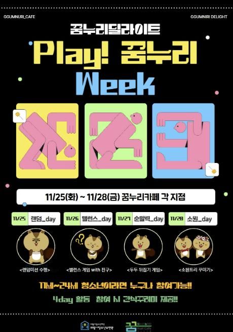 [비건뉴스=최지영 수습기자] 의왕시청소년재단 산하 의왕시청소년수련관 꿈누리카페(▲고천점( 문화공원로 33), ▲내손점(복지로 109), ▲오전점(찬우물길 11), ▲백운밸리점(백운중앙로 74, 총 4개 지점))는 오는 11월 25일부터 28일까지 4일간 꿈누리딜라이트 『Play! 꿈누리 Week』를 진행한다고 밝혔다.
