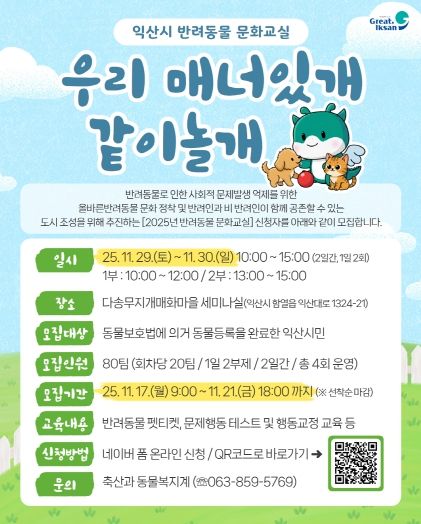 [비건뉴스=최지영 수습기자] 익산시가 올바른 반려동물 문화 확산을 위한 교육의 장을 연다.