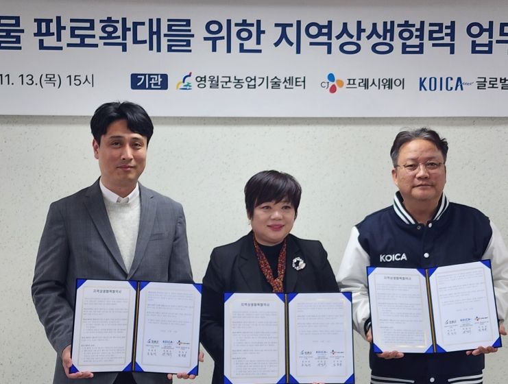 [비건뉴스=최지영 수습기자] 영월군농업기술센터는 2025년 11월 13일 목요일 오후 3시, 영월군농업기술센터 2층 회의실에서 CJ프레시웨이, KOICA글로벌인재교육원과 함께 지역상생협력 업무협약을 체결했다.