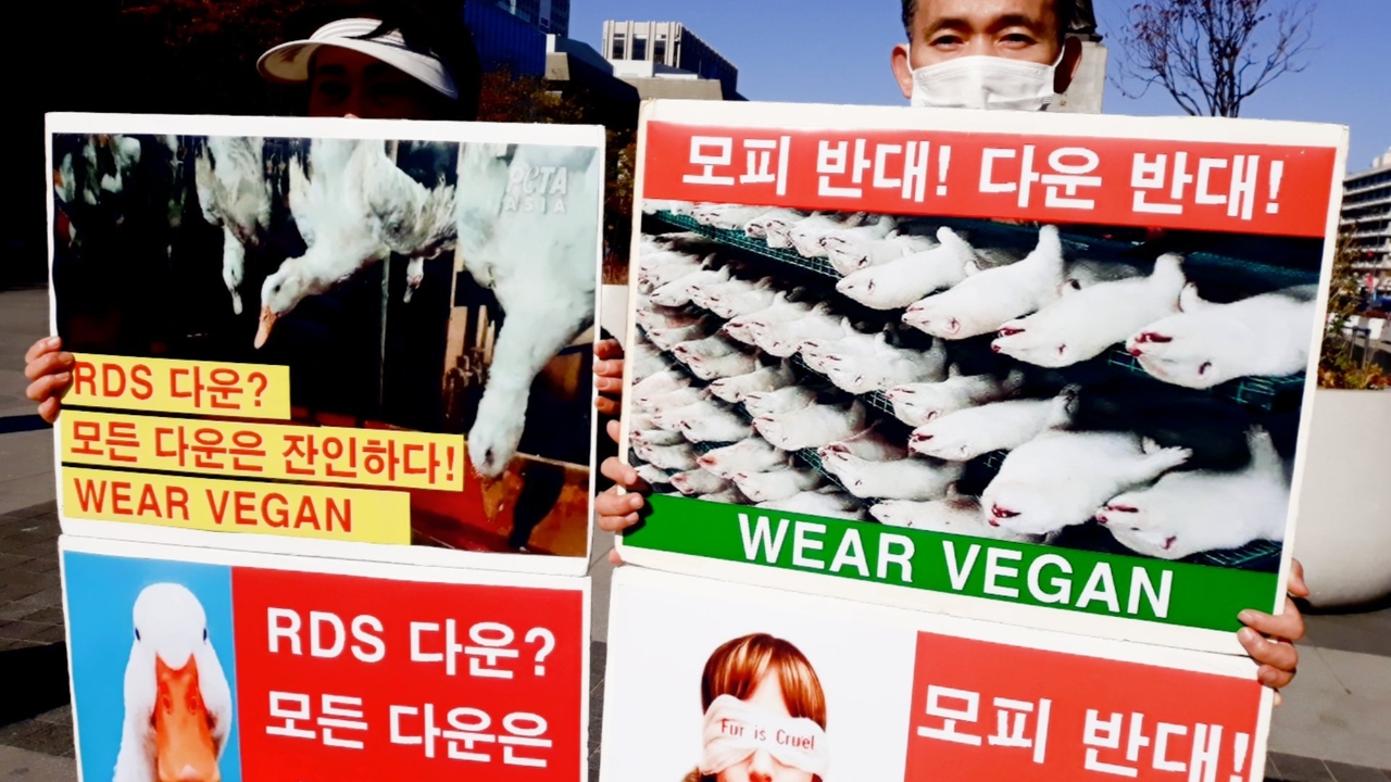 [비건뉴스=최유리 기자] 광화문 이순신동상 앞에서 한국동물보호연합, 기후위기비건행동, 한국비건채식협회, 비건세상을위한시민모임, 한국채식연합 등이 모피와 다운 생산 과정의 동물학대 문제를 알리는 기자회견을 열었다. 참가자들은 모피와 다운을 얻기 위해 야생동물과 오리·거위가 겪는 고통이 여러 국제 보고를 통해 지속적으로 제기돼 왔다고 설명하며, 겨울철 의류 소비에서 동물성 소재 대신 비건 제품을 선택해 달라고 호소했다.