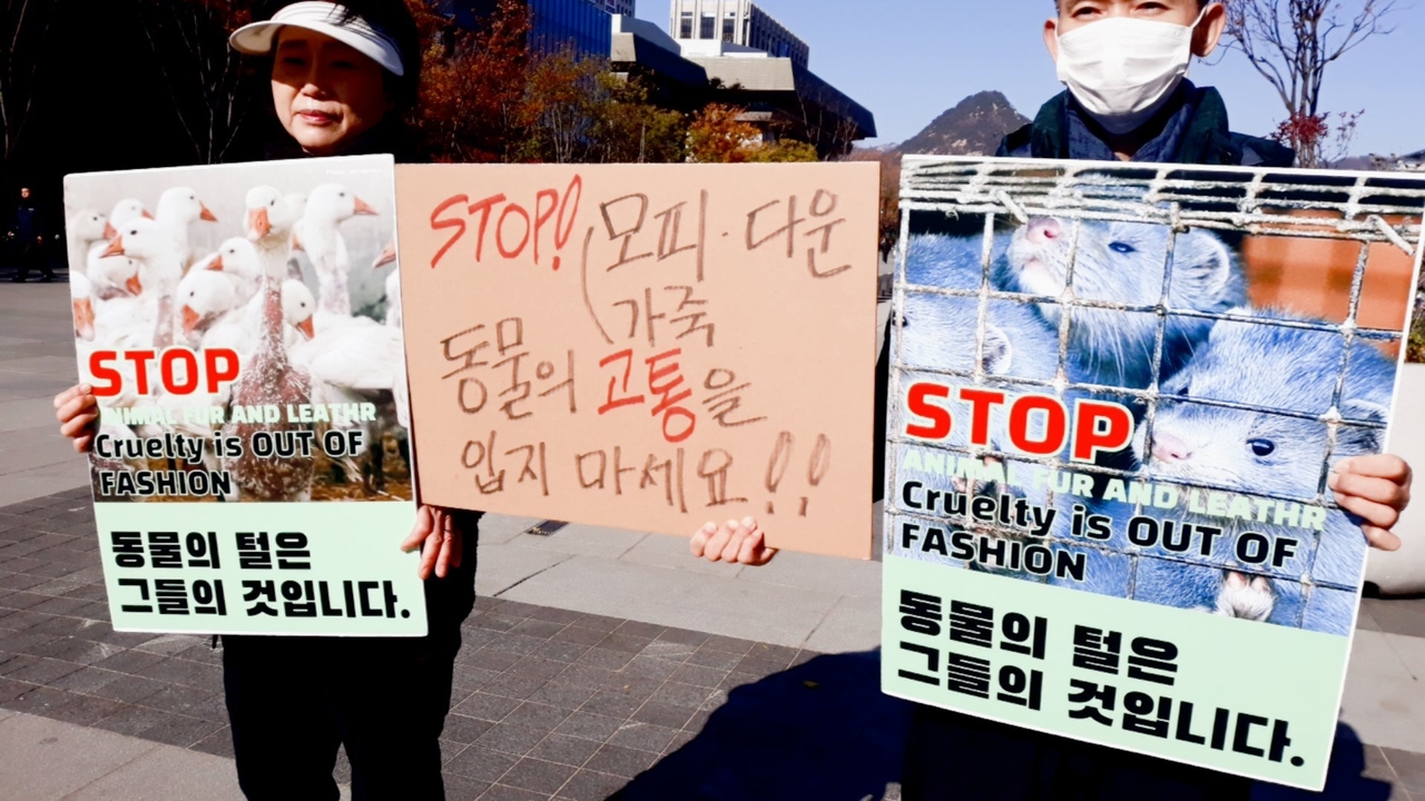 [비건뉴스=최유리 기자] 광화문 이순신동상 앞에서 한국동물보호연합, 기후위기비건행동, 한국비건채식협회, 비건세상을위한시민모임, 한국채식연합 등이 모피와 다운 생산 과정의 동물학대 문제를 알리는 기자회견을 열었다. 참가자들은 모피와 다운을 얻기 위해 야생동물과 오리·거위가 겪는 고통이 여러 국제 보고를 통해 지속적으로 제기돼 왔다고 설명하며, 겨울철 의류 소비에서 동물성 소재 대신 비건 제품을 선택해 달라고 호소했다.