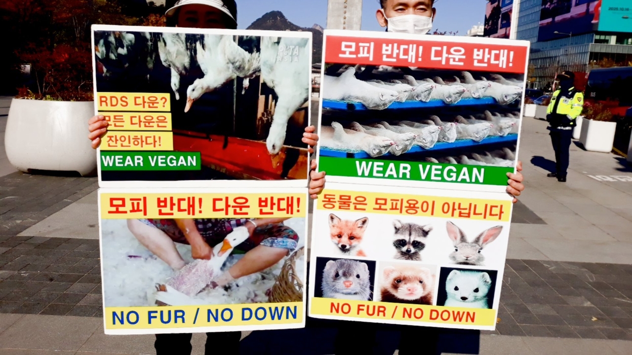 [비건뉴스=최유리 기자] 광화문 이순신동상 앞에서 한국동물보호연합, 기후위기비건행동, 한국비건채식협회, 비건세상을위한시민모임, 한국채식연합 등이 모피와 다운 생산 과정의 동물학대 문제를 알리는 기자회견을 열었다. 참가자들은 모피와 다운을 얻기 위해 야생동물과 오리·거위가 겪는 고통이 여러 국제 보고를 통해 지속적으로 제기돼 왔다고 설명하며, 겨울철 의류 소비에서 동물성 소재 대신 비건 제품을 선택해 달라고 호소했다.