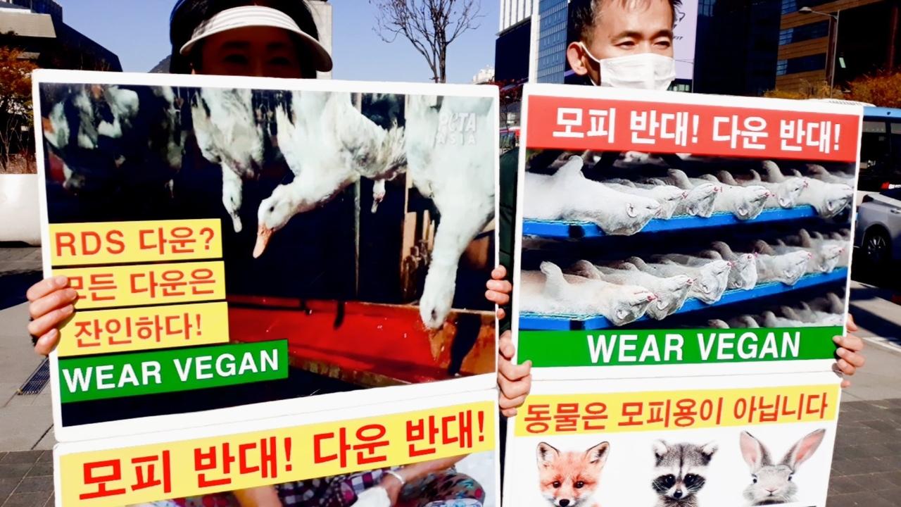 [비건뉴스=최유리 기자] 광화문 이순신동상 앞에서 한국동물보호연합, 기후위기비건행동, 한국비건채식협회, 비건세상을위한시민모임, 한국채식연합 등이 모피와 다운 생산 과정의 동물학대 문제를 알리는 기자회견을 열었다. 참가자들은 모피와 다운을 얻기 위해 야생동물과 오리·거위가 겪는 고통이 여러 국제 보고를 통해 지속적으로 제기돼 왔다고 설명하며, 겨울철 의류 소비에서 동물성 소재 대신 비건 제품을 선택해 달라고 호소했다.
