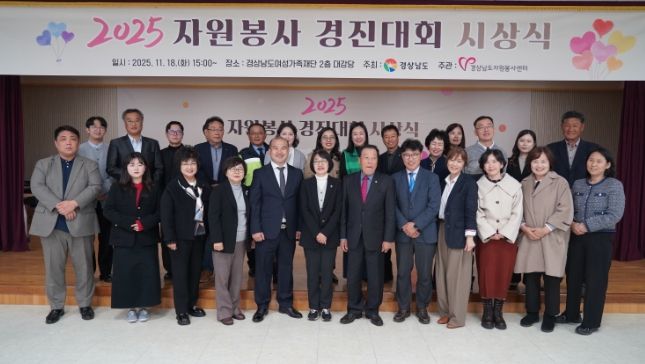 [비건뉴스=최지영 수습기자] 경상남도는 18일 경남여성가족재단 대강당에서 ‘2025 자원봉사 경진대회 시상식’에서 지역사회 자원봉사 활성화에 기여한 29개 팀에 도지사상을 수여했다고 밝혔다.