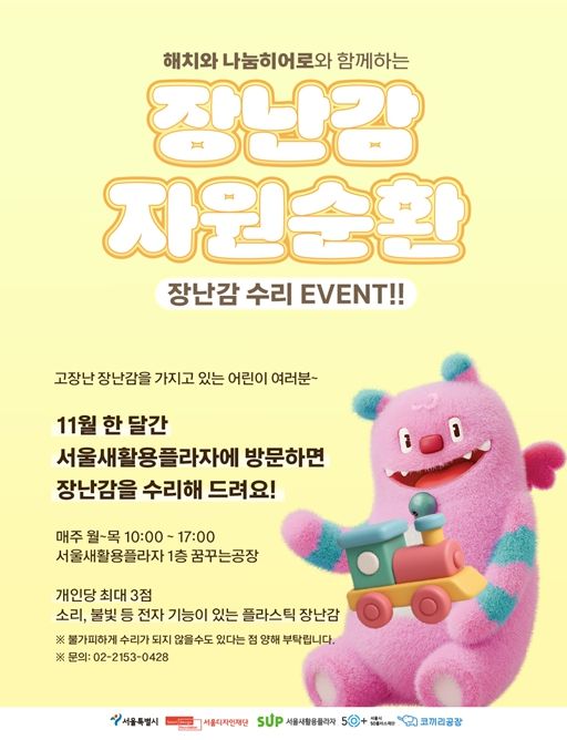 서울디자인재단이 운영하는 서울새활용플라자가 11월 시민과 함께하는 장난감 자원순환 캠페인 ‘해치와 나눔히어로’를 운영한다. 11월 20일 열리는 ‘2025 자원순환 시민행사–초록이의 지구여행’을 시작으로, 22일·29일 양일간 서울새활용플라자에서 장난감 기부데이가 연이어 진행된다.